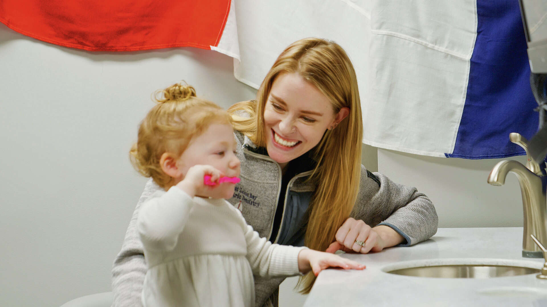 Our pediatric dentist will start by conducting a gentle examination of your child’s mouth to assess the development of their teeth and gums. To ensure a comfortable and stress-free experience for both you and your infant, we’ll perform this while sitting “knee-to-knee”. This means that your child will lay on your lap with their legs wrapped around your waist while their head rests on a comfortable surface on our dentist’s lap.